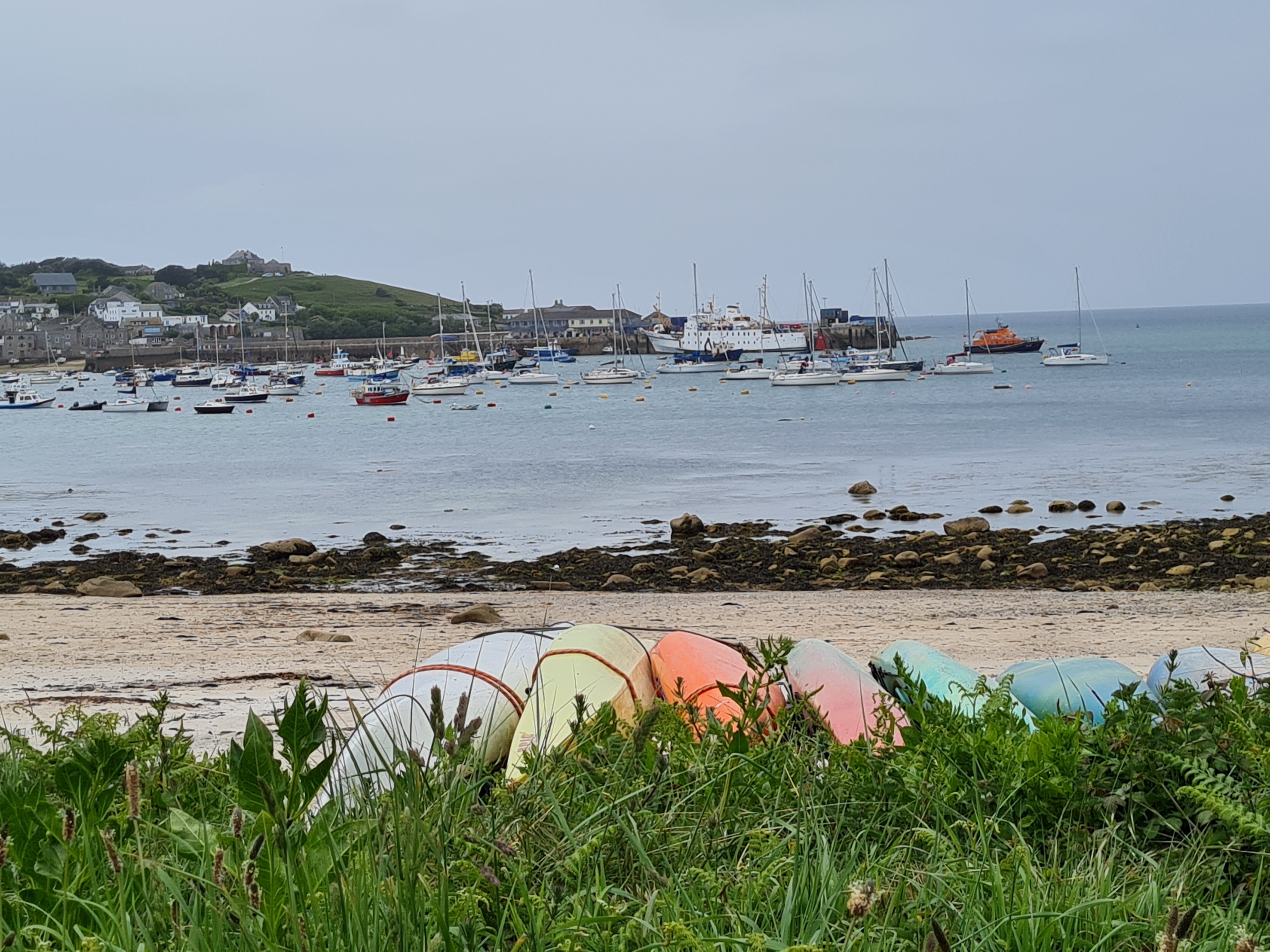 Today humans can reach the Isles of Scilly by boat, plane, and helicopter. We took a family day trip on the Scillonian III on a calm day to St. Mary’s, just under three hours each way. It doesn’t leave time to do much on the isle, but we did some walking after we warmed up from the deck views with cups of tea in town.